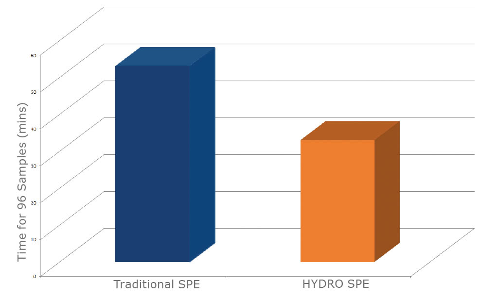 Automated extraction on Biotage¢ç Extrahera¢â using traditional SPE takes 53 minutes for 96 samples. With EVOLUTE¢ç HYDRO this time is reduced to 33 minutes. [30 mg format, using equivalent extraction methodology. Full procedure including hydrolysis, eluent evaporation and reconstitution: 143 mins (traditional SPE) 123 mins (HYDRO SPE)].